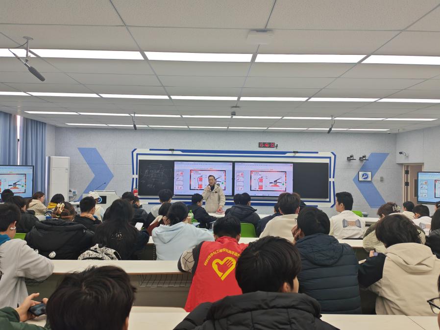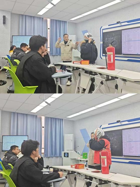 培训采用“理论讲解+实地实操”模式,确保知识技能双落实。室内理论环节,王子龙老师结合校园实际场景,聚焦宿舍用电隐患、实验室危化品操作等高频风险点,通过典型火灾案例剖析,直观讲解火灾预防、初期火情识别及逃生自救技巧,让师生深刻认识消防安全的重要性。同时,老师现场分发消防手册,详解干粉灭火器参数,提炼“提拔握压”实操口诀,手把手演示防火面罩佩戴方法,并邀请学生上台体验,助力快速掌握应急器材使用要领。
