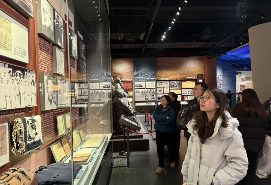 步入纪念馆,“救亡图存”展厅以丰富的展陈再现了百年党史的壮阔历程。栩栩如生的浮雕、历经沧桑的文物,将成员们带回那段风雨如磐的年代。泛黄的照片映照出近代中国的屈辱与挣扎,冰冷的柱状数据刻录着不平等条约下的民生疾苦。从虎门销烟的奋起反抗到辛亥革命的艰辛求索,中国人民救亡图存的脚步从未停歇,却始终未能改变旧中国积贫积弱、内忧外患的局面。
