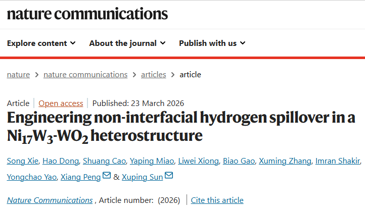 (通讯员:刘虎森)近日,材料科学与工程学院熊礼威与彭祥教授团队在氢能催化研究领域取得重要进展,相关成果以“Engineering non-interfacial hydrogen spillover in a Ni17W3-WO2 heterostructure”为题发表在国际著名期刊《自然·通讯》(Nature Communications, IF: 15.7)上。研究提出了应变梯度工程这一通用设计策略,成功在非贵金属异质结催化剂中实现了高效的“非界面氢溢流”,为低成本、高性能电催化剂的理性设计开辟了新路径。材料学院博士研究生谢松为论文第一作者,彭祥和四川大学孙旭平教授为通讯作者,熊礼威教授为共同作者。我校为论文第一单位。