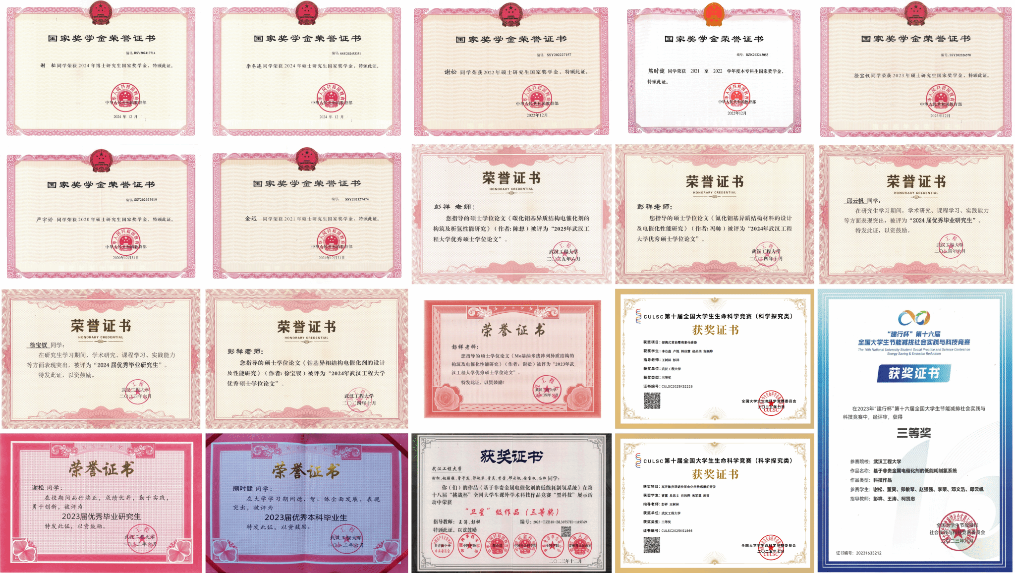 彭祥教授指导研究生谢松以“基于非贵金属电催化剂的低能耗制氢系统”项目,先后荣获“挑战杯”全国大学生课外学术科技作品竞赛“黑科技”专项赛三等奖、全国大学生节能减排社会实践与科技竞赛三等奖,指导本科生李芯蕊和曹霜分别获得了全国大学生生命科学竞赛三等奖。
