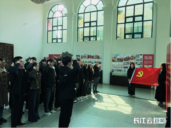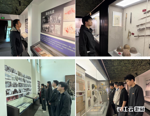 在湖北军民抗战博物馆前,全体党员面向鲜红的党旗庄严伫立,高举右拳重温入党誓词,铿锵有力的誓言回荡现场,彰显新时代高校党员坚守初心、勇担使命的坚定信念。随后,师生们走进博物馆沉浸式学习,通过历史照片、抗战实物等珍贵史料,直观感受革命先辈的奋斗历程,进一步坚定铭记历史、珍爱和平、开创未来的理想追求。