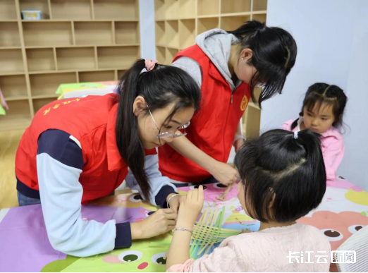 4月19日,武汉工程大学材料科学与工程学院“小蓝钻”志愿服务队走进佛祖岭街道和顺社区,开展“科韵童风·智趣工坊”主题志愿活动第二期。这里没有刻板的说教,只有一声声亲切的方言问候、一曲曲悠扬的民族山歌,还有一双双小手在竹编与翻花间穿梭——这场别开生面的非遗课堂,让民族团结的种子在孩子们的童心中悄然生根。