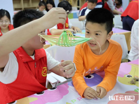 “你看你看!这是我的翻花,我给它起名叫小彩龙!”一位小朋友高高举起自己的作品,兴奋地跑到志愿者身边,眼睛笑弯成了月牙。不一会儿,教室里满是举着竹编小船和龙头翻花奔跑的小小身影,孩子们三五成群展示着自己的得意之作,欢笑声此起彼伏。